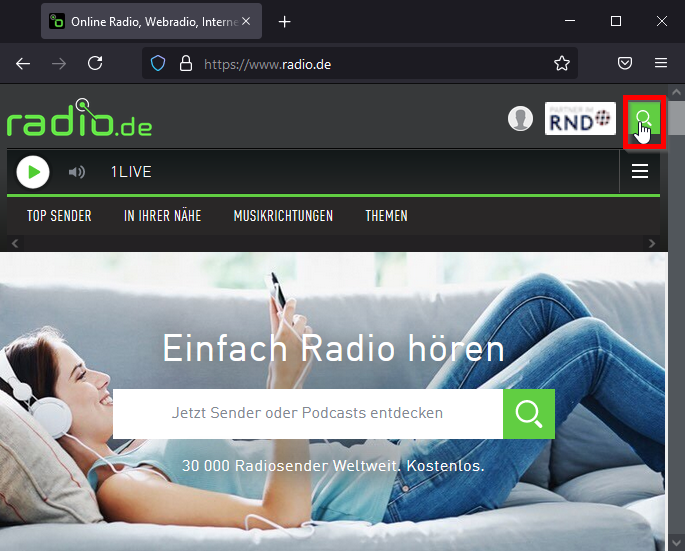Im Browser deiner Wahl https://radio.de oder https://radio.net (ist das selbe) aufrufen und oben rechts auf die Lupe klicken. Im Suchfeld "Radio Zeitz" eingeben und mit "Enter" bestätigen